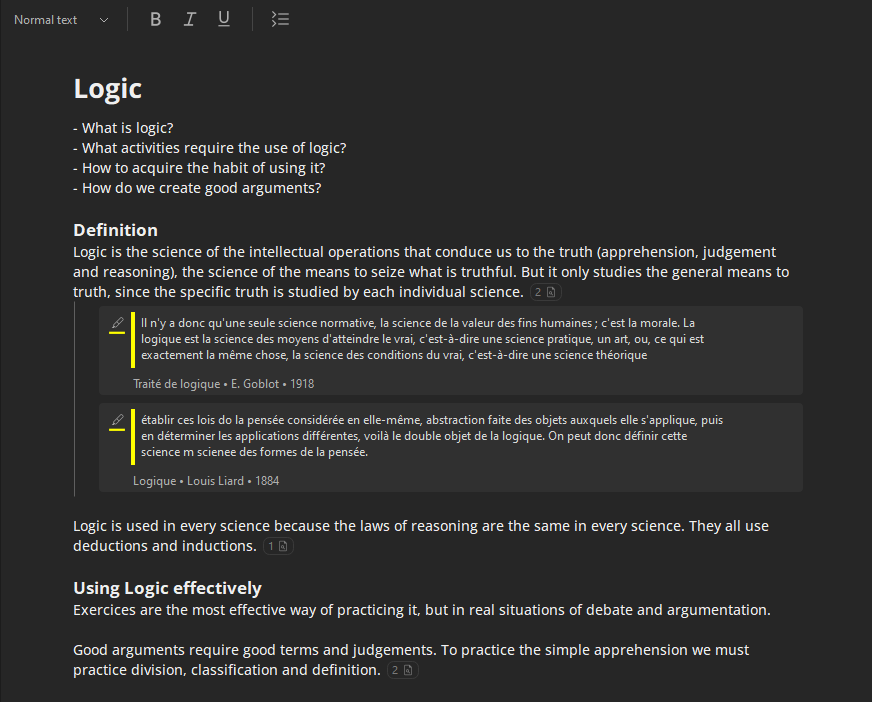 After that, I start reading and highlighting any passage that advances substantially my understanding of the issue. Then, instead of leaving that highlight buried inside my books or documents, I associate that highlight with a key sentence in the initial draft. If the information or insight is completely new, I instead write an additional key sentence that summarizes it in my own words and associate the highlight with it. On Cahier, I turn the key sentences into collapsible panels that can store the highlight cards as children and that can show how many highlights there are, but in other software, a collapsible outline or a similar structure should suffice. The draft becomes the document that stores the knowledge shared across the several books.