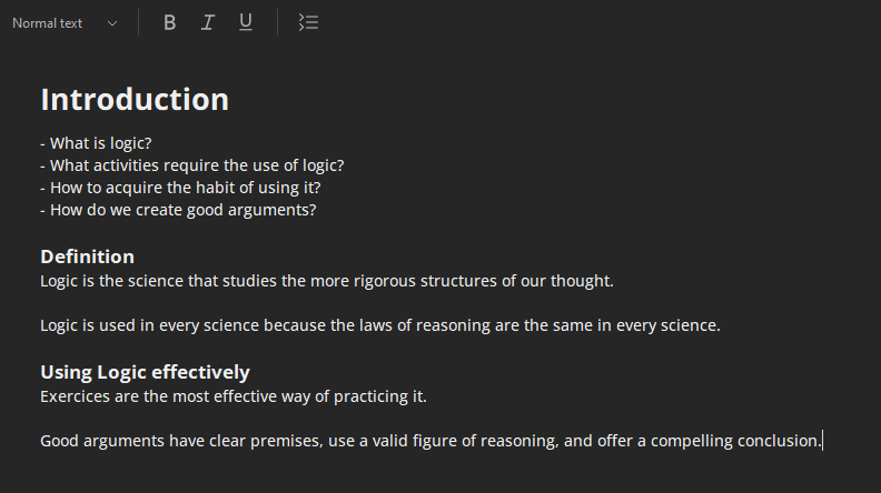 To achieve this, I create a document where I write down the questions that I want to solve, headings for what I imagine to be the major divisions of the subject, along with my personal opinions. For example, if I were writing about logic, I would write a document like the one below, with four questions, three headings, and four claims.